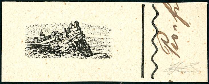 1918 - Pro combattenti, prova in nero del centro raffigurante una veduta del Monte Titano, su carta grigiastra, bordo di foglio, non ... Read more