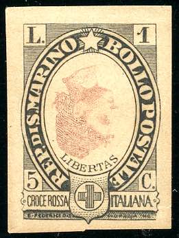 1923 - 1 lira + 5 cent. Croce Rossa, prova di stampa della cornice in nero con il centro in rosso bruno capovolto su carta sottile (96,nota), non dentellata e senza gomma come sempre.