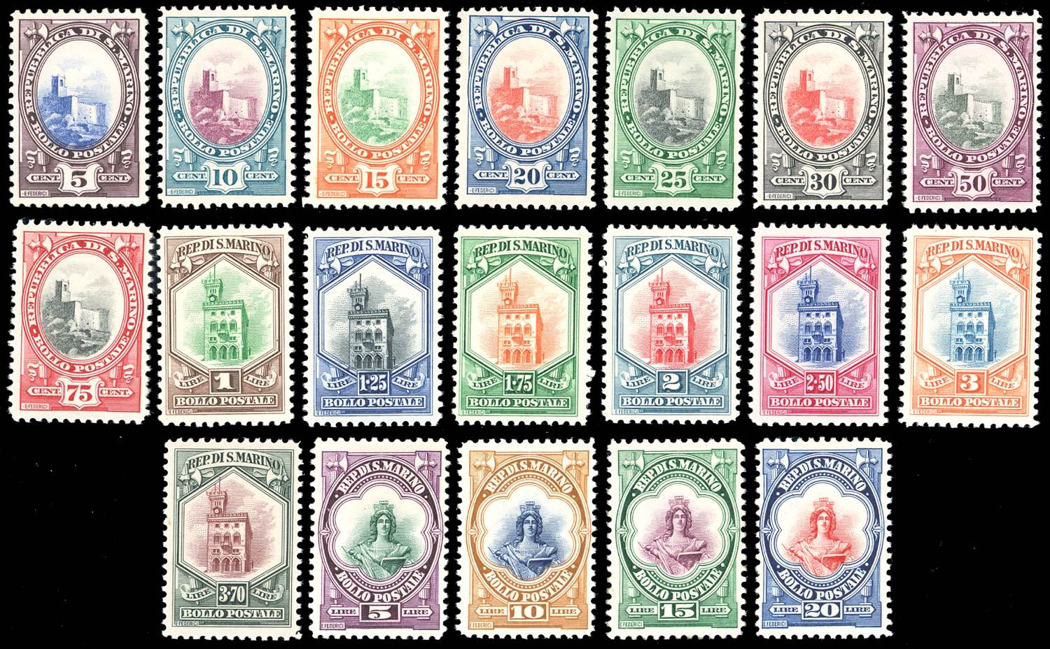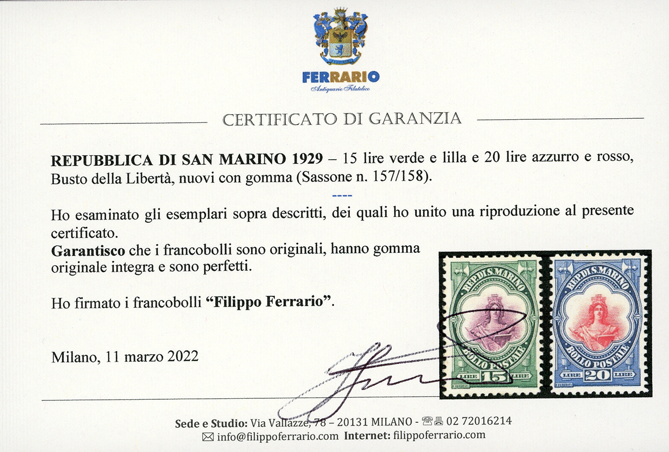 1929 - Veduta, Palazzo del Consiglio e Libertà, serie completa (141/158), gomma originale integra, perfetti. Molto belli. Cert. Ferrario per i due alti valori.