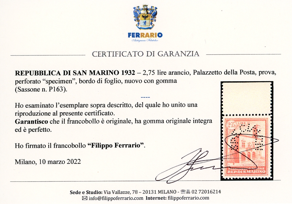 1932 - 2,75 lire arancio Palazzetto della Posta, perforato "specimen" (P163). Bordo di foglio, gomma originale integra, perfetto. Cert. ... Read more