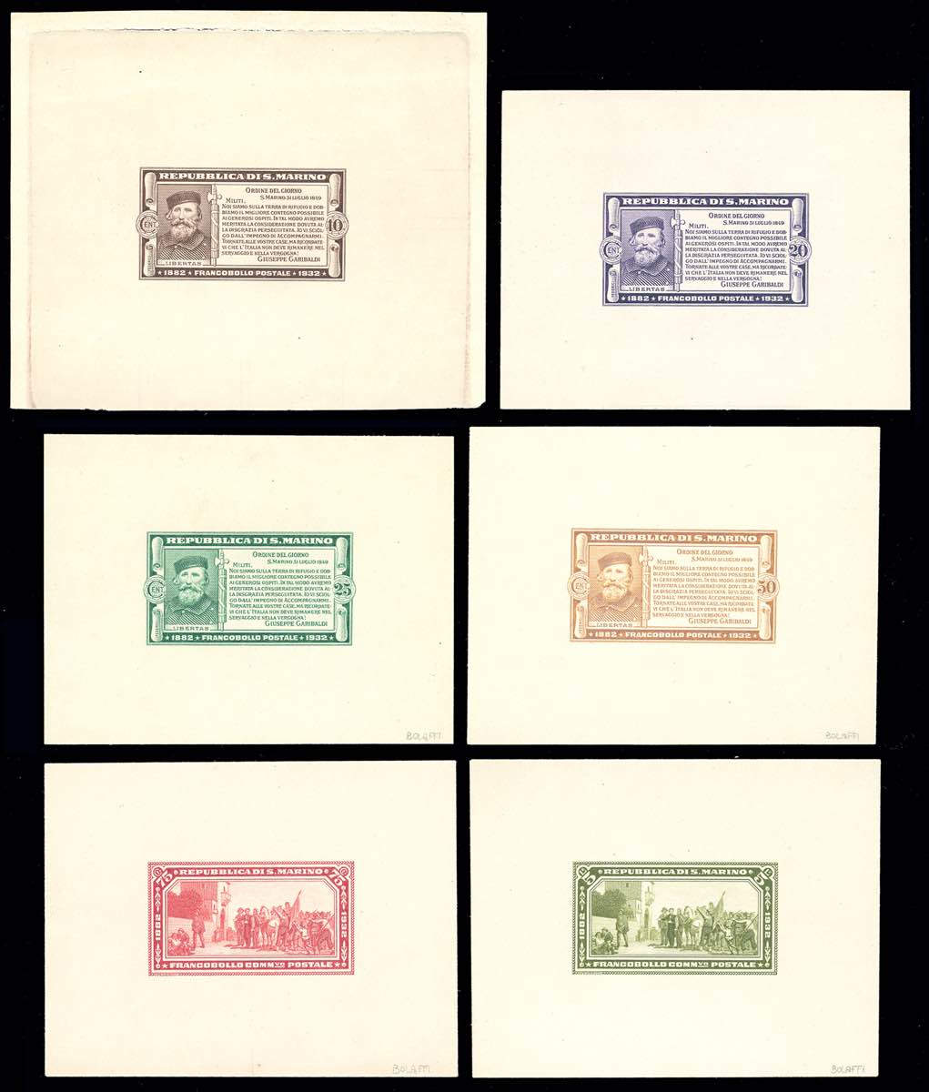1932 - 10 cent., 20 cent., 25 cent., 50 cent., 75 cent., 5 lire Garibaldi (168/172,175), prove di conio nei colori adottati, su foglietti di carta color avorio cm. 8 x 6 ca., nuove senza gomma come sempre, perfette. Splendide e molto rare. Tre cert. E.Diena, due Raybaudi.