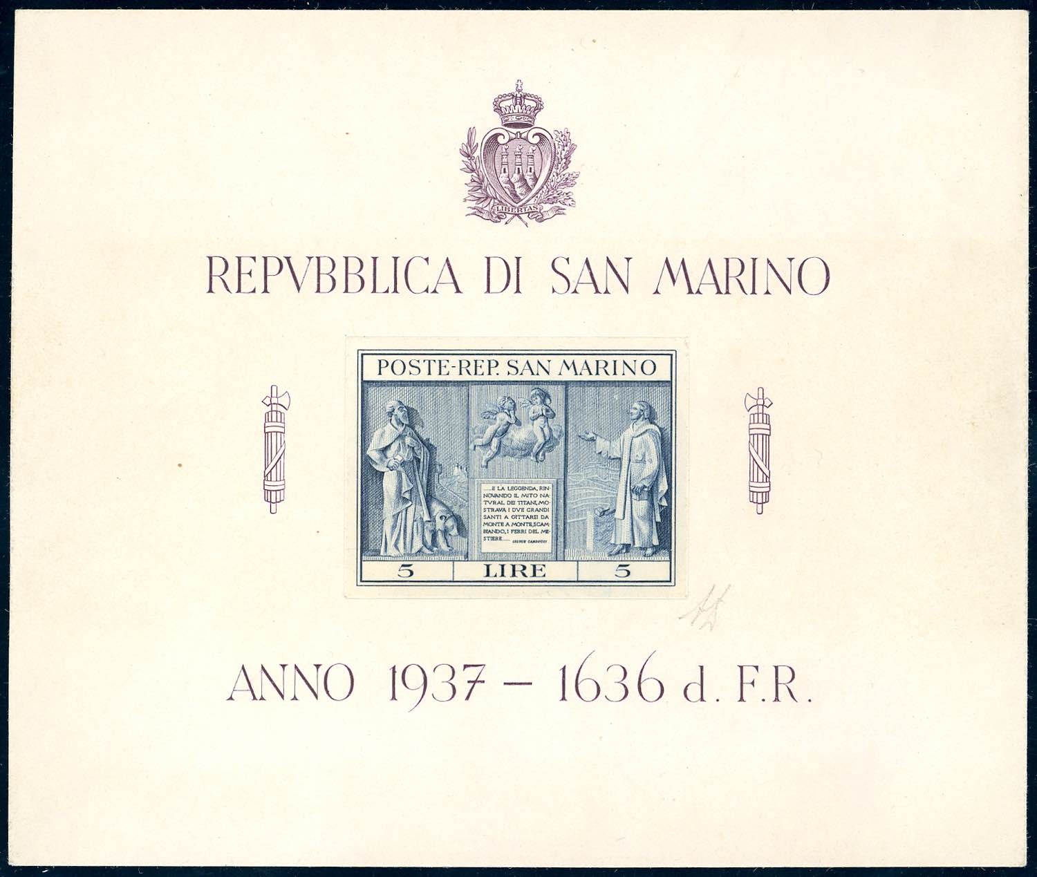 1937 - 5 lire Indipendenza, foglietto (1), prova con le diciture nel colore adottato, con applicata al centro la prova calcografica non ... Read more