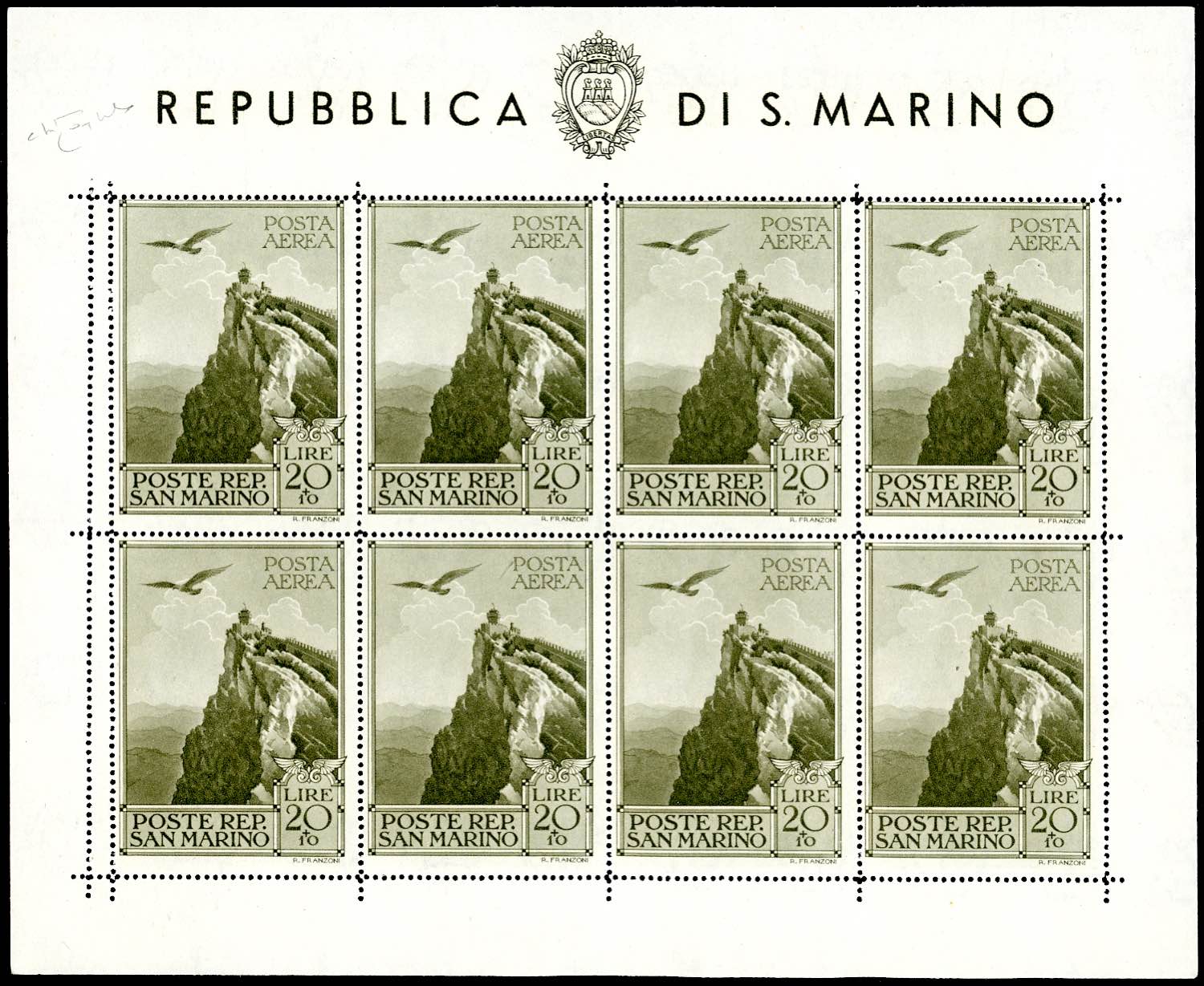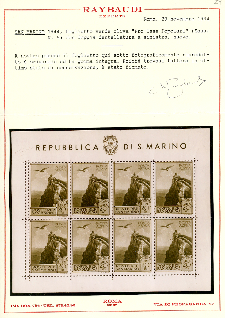1944 - 20 + 10 lire verde oliva Case Popolari, foglietto, doppia dentellatura a sinistra (5ab), gomma originale integra, perfetto. Cert. Raybaudi.