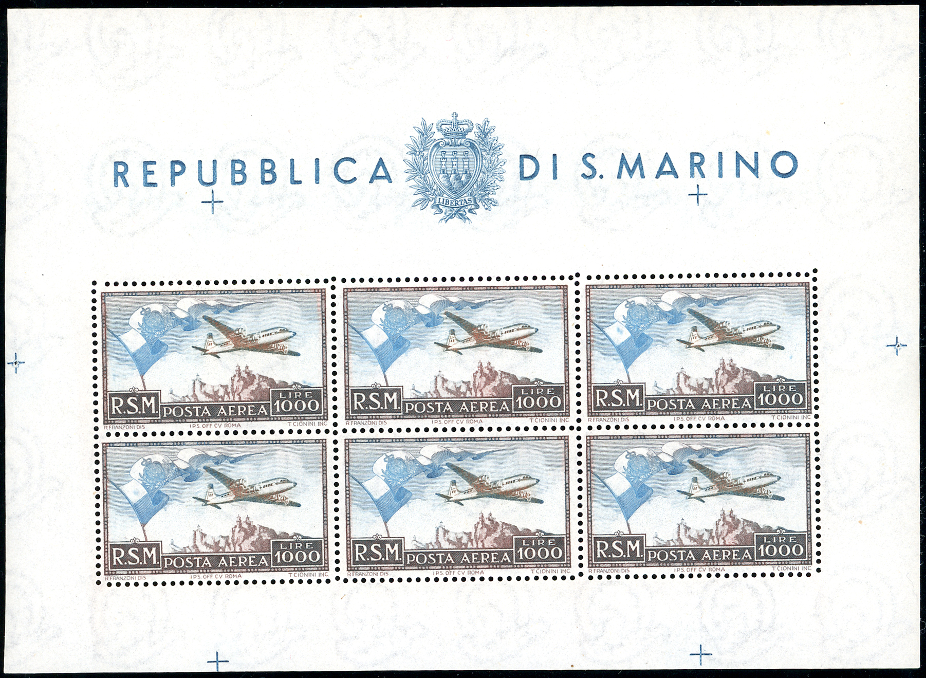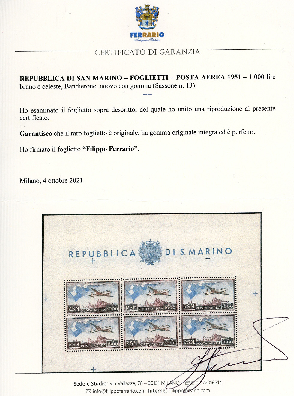 1951 - 1.000 lire Bandierone, foglietto (13), gomma originale integra, perfetto. Raro e molto bello. Cert. Bolaffi e Ferrario.