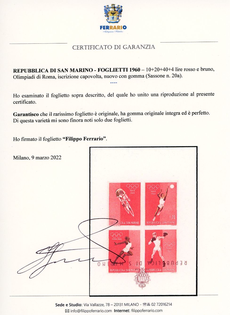 1960 - Olimpiadi di Roma, foglietto, iscrizione capovolta (20a), gomma originale integra, perfetto. Rarissimo, DUE SOLI ESEMPLARI NOTI. ... Read more
