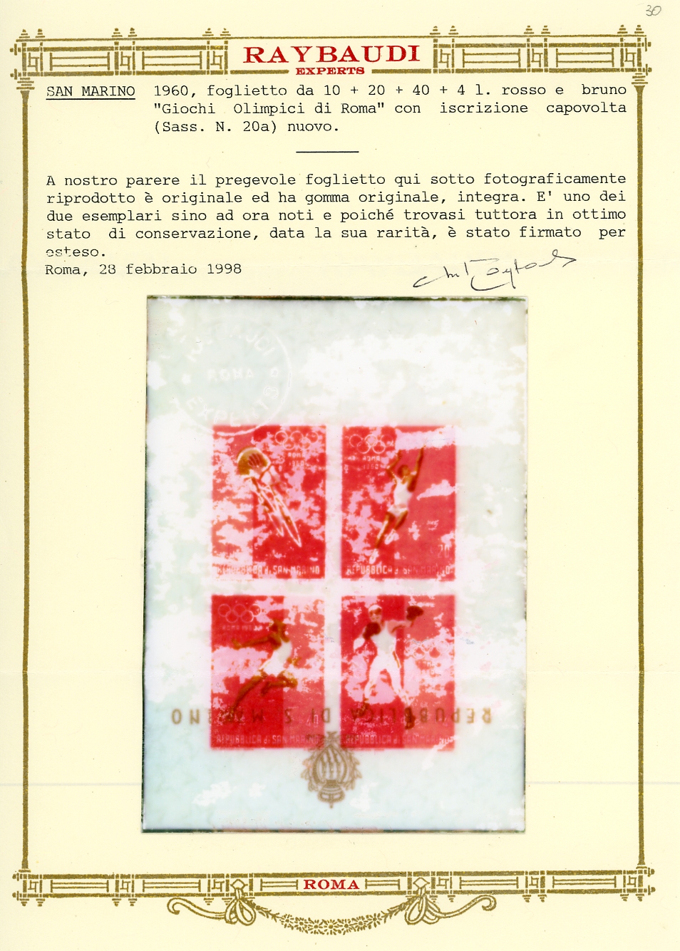 1960 - Olimpiadi di Roma, foglietto, iscrizione capovolta (20a), gomma originale integra, perfetto. Rarissimo, DUE SOLI ESEMPLARI NOTI. Cert. Oro Raybaudi, Ferrario.