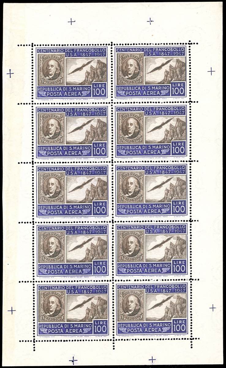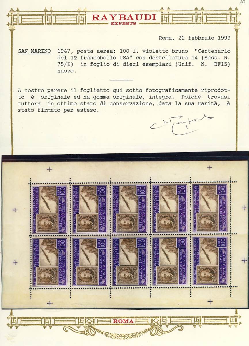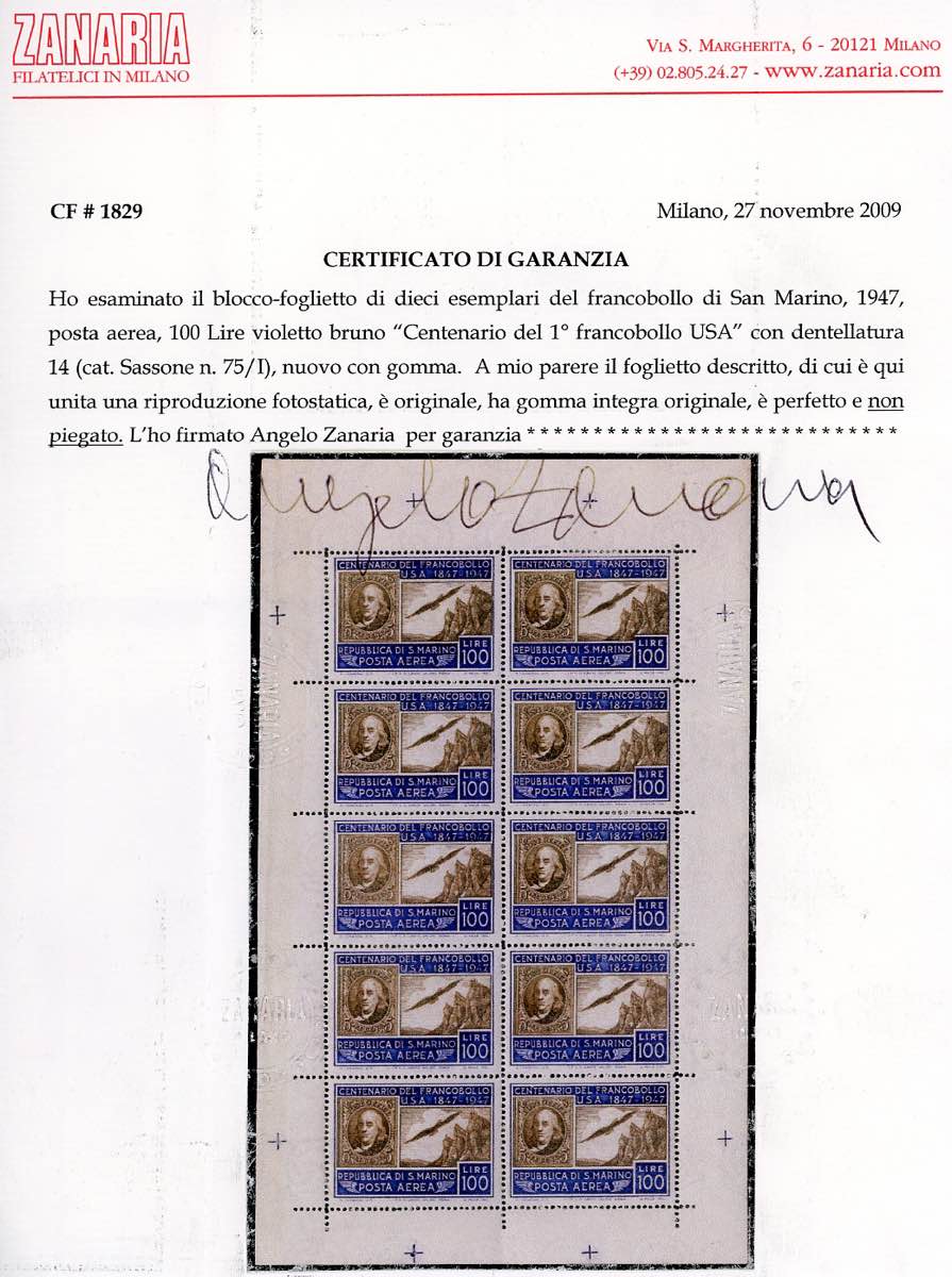 1947 - 100 lire Centenario francobollo americano, minifoglio senza piega (8), gomma originale integra, perfetto. Molto bello. Cert. Zanaria ... Read more