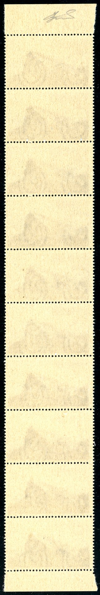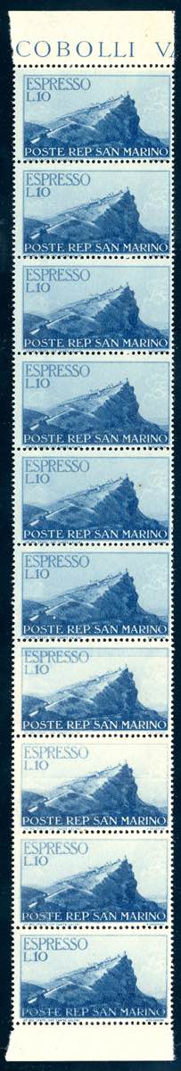 1946 - 10 lire Veduta, striscia verticale di dieci, gli ultimi quattro esemplari con stampa evanescente (14a,nota), bordo di foglio, gomma originale integra, perfetta. Ferrario.