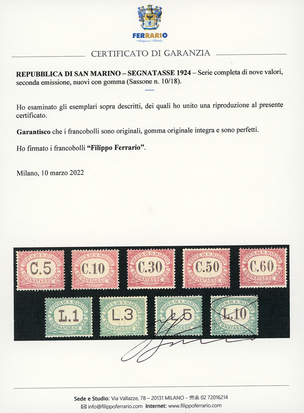 1924 - Seconda emissione, serie completa (10/18), gomma originale integra, perfetti. Molto freschi. Cert. Ferrario.