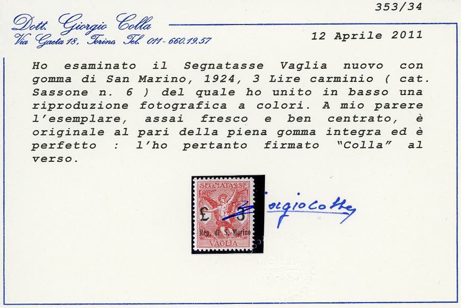 1924 - 3 lire (6), ottima centratura, gomma originale integra, perfetto. Splendido e molto raro di questa qualità. Eccezionale! Cert. ... Read more