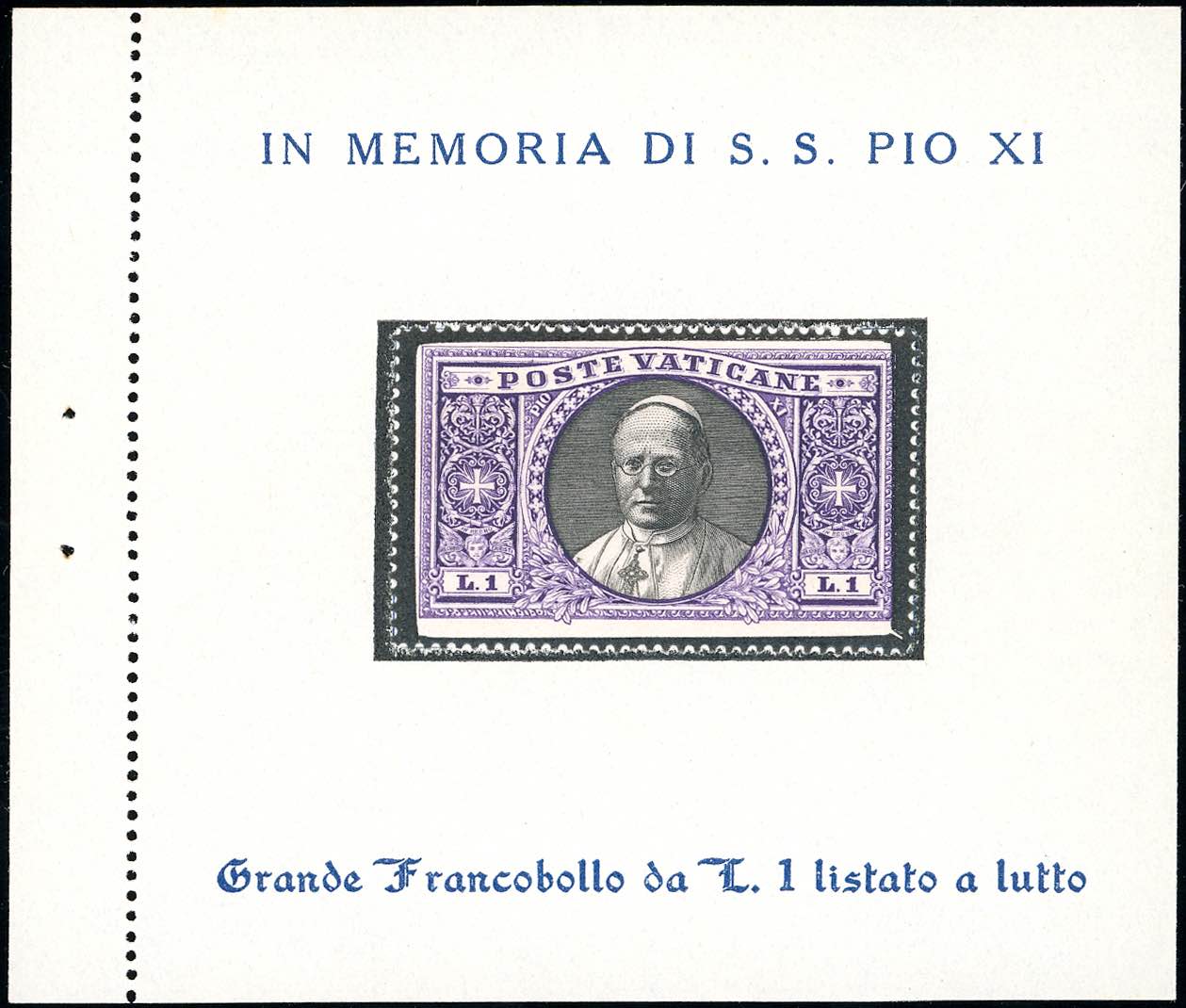 1939 - 1 lira Medaglioni listato a lutto, francobollo ricordo (CEI1b), applicato sul foglietto, gomma originale, perfetto.