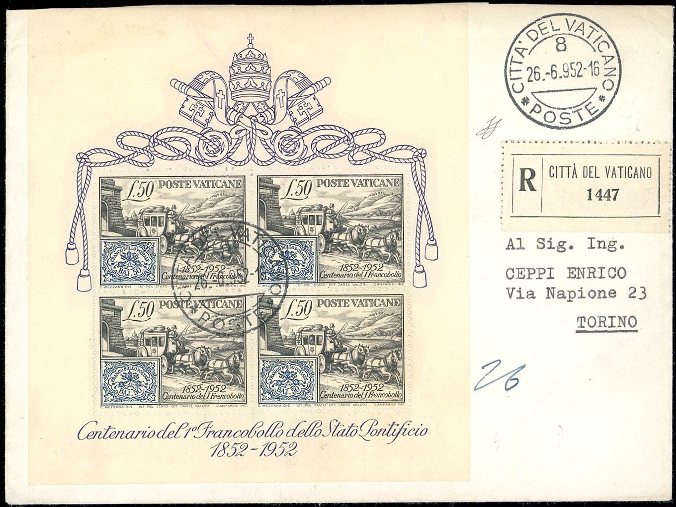 1952 - 50 lire Centenario francobolli dello Stato Pontificio, foglietto (1), perfetto, su busta raccomandata da Città del Vaticano 26/6/1952 a Torino. Ferrario.