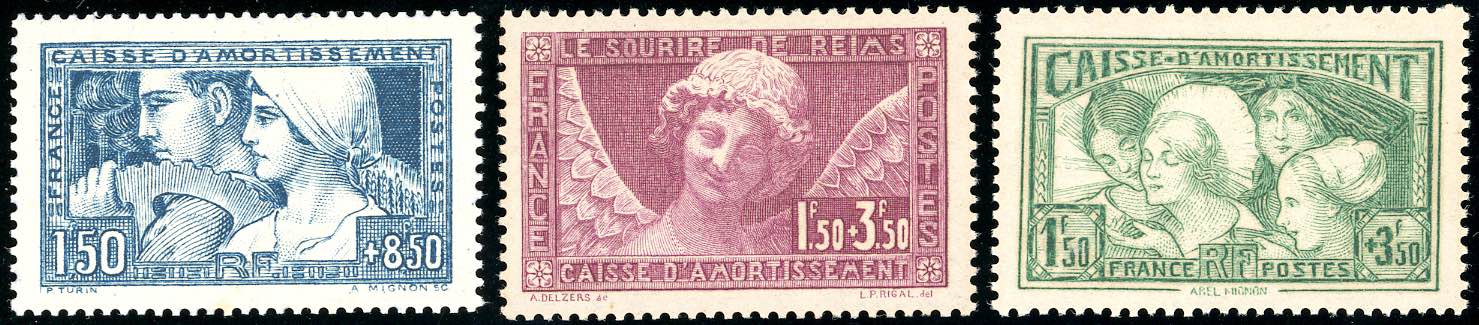 FRANCIA 1928/31 - Pro cassa d'ammortamento, tre valori (252,256,269), nuovi, gomma originale integra, perfetti. Ottima qualità.