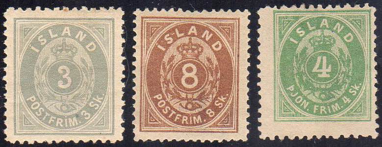 ISLANDA 1873 - 3 s. grigio, 8 s. bruno, 4 s. verde servizio (2,4,S.1A), nuovi, gomma originale, perfetti. E.Diena.