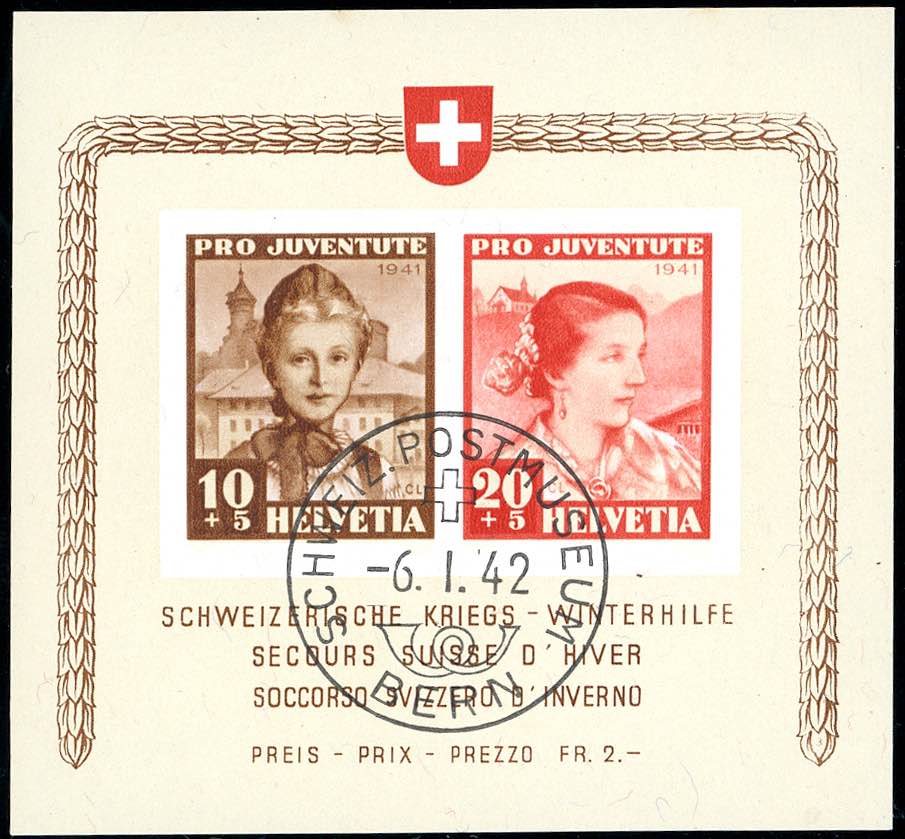 SVIZZERA FOGLIETTI 1941 - Pro Juventute, foglietto (BF6), perfetto, usato con l'annullo del Museo postale di Berna 6/1/1942. Bello.
