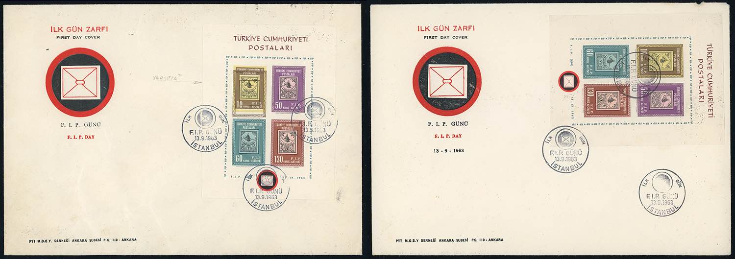 TURCHIA FOGLIETTI 1963 - Giornata FIP, foglietto (BF11), varietà stampa del nero spostato in basso sul n. 1671A, usato su busta FDC. Allegato confronto.