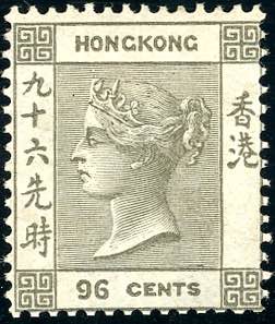 BRITISH COLONIES - HONG KONG 1862 - 96 c. Regina Vittoria, senza filigrana (Yv.7), gomma originale MH, perfetto. Raro e molto fresco. A.Diena.
