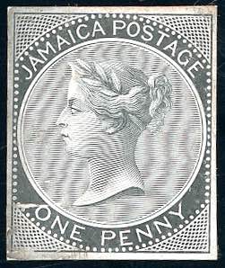 BRITISH COLONIES - JAMAICA 1860 - 1 p. Regina Vittoria (1), prova di conio su cartoncino gessato spesso, senza gomma, perfetta. Bellissima e rara!