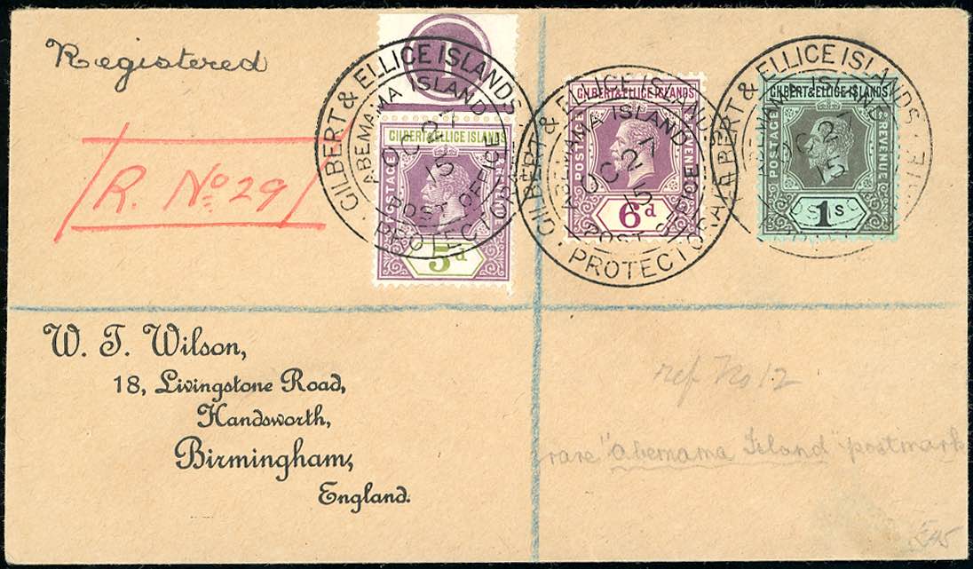 BRITISH COMMONWEALTH - GILBERT AND ELLICE ISLAND 1915 - 5 d., bordo di foglio con numero di tavola, 6 d., 1 s. Giorgio V (S.G.18,19,20), perfetti, su busta raccomandata da Abemama Island 27/10/1915 per la Gran Bretagna. Rara e molto bella!