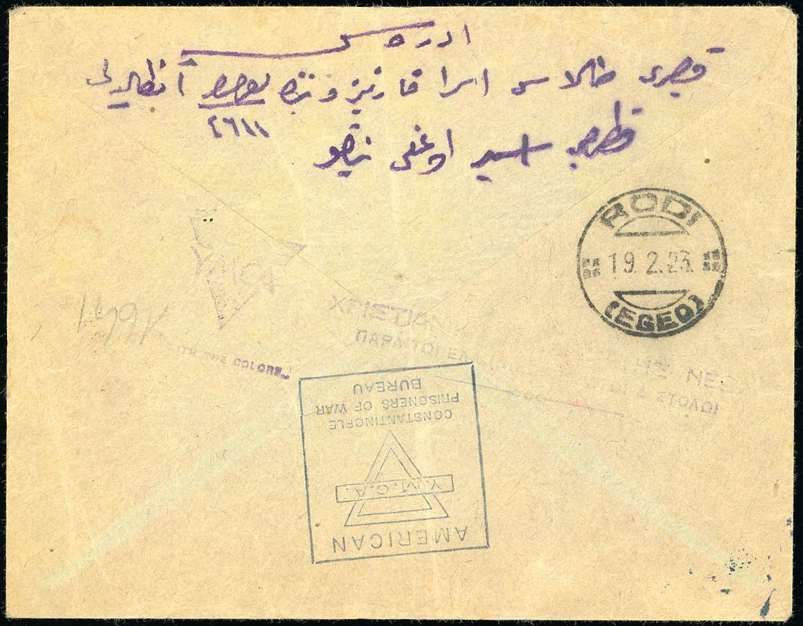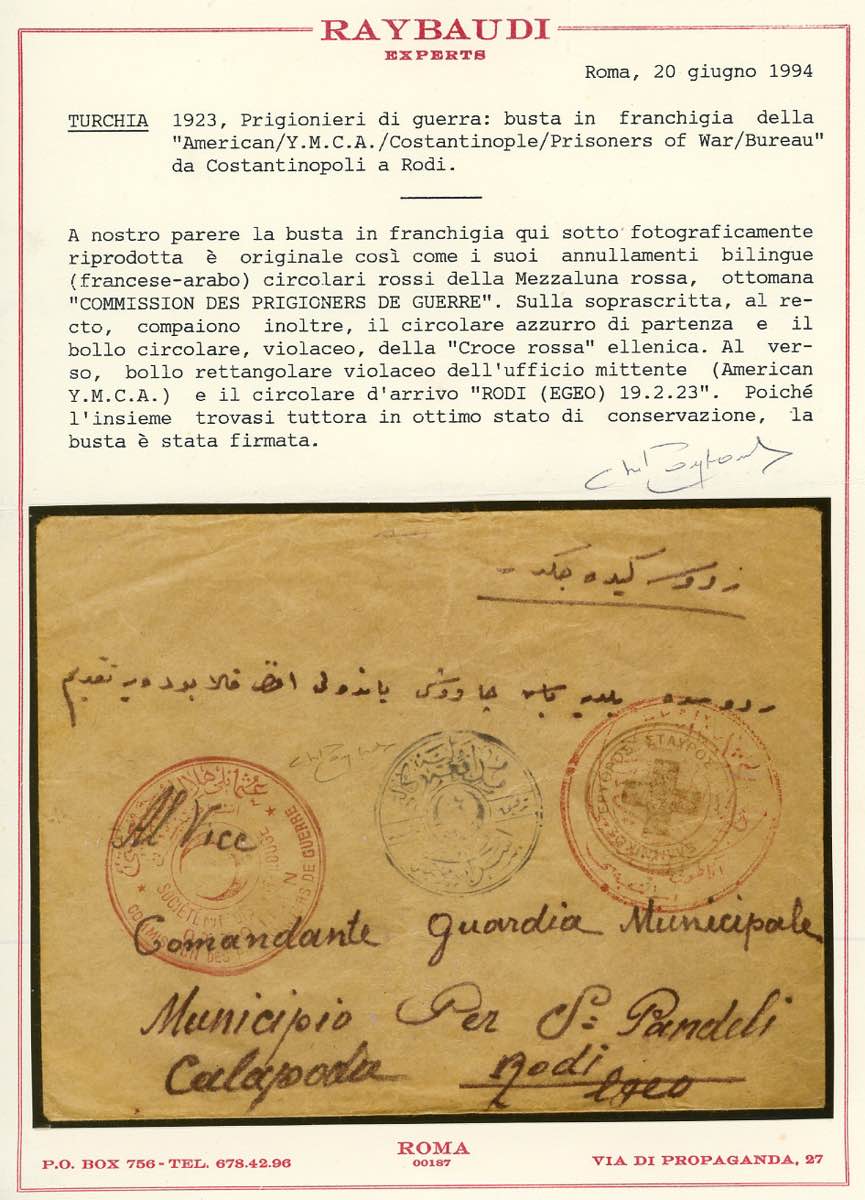 TURCHIA 1923 - Busta in franchigia della Americana Y.M.C.A. Costantinople Prisoners of War Bureau da Costantinopoli a Rodi 19/2/1923, bolli della Mezzaluna e della Croce Rossa. Bella ed interessante. Cert. Raybaudi.