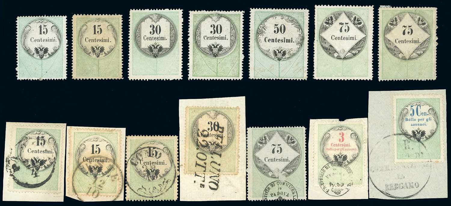 LOMBARDO VENETO MARCHE DA BOLLO 1854 - Bell'insieme di 14 esemplari, nuovi senza gomma, usati o su frammento, con annulli postali o ... Read more