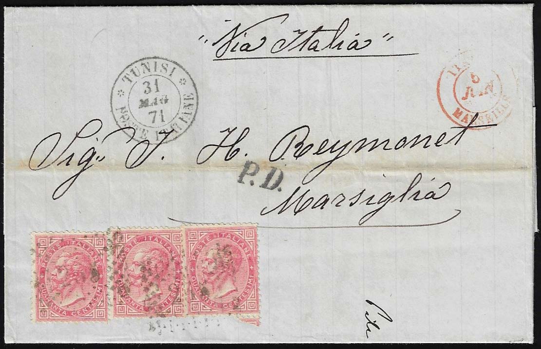 TUNISI 1871 - 40 cent. De La Rue (T20), tre esemplari, perfetti, su lettera da Tunisi 31/5/1871 a Marsiglia. Non comune affrancatura ... Read more