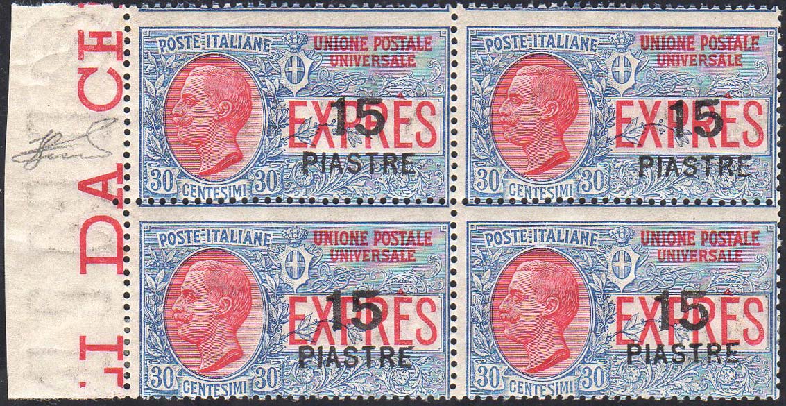 COSTANTINOPOLI ESPRESSI 1922 - 15 pi. su 30 cent. soprastampa più grande (2), blocco di quattro, gomma originale integra, perfetto. Raro. Ferrario.