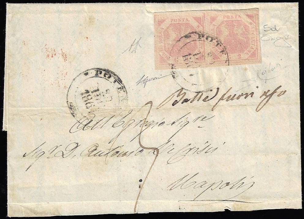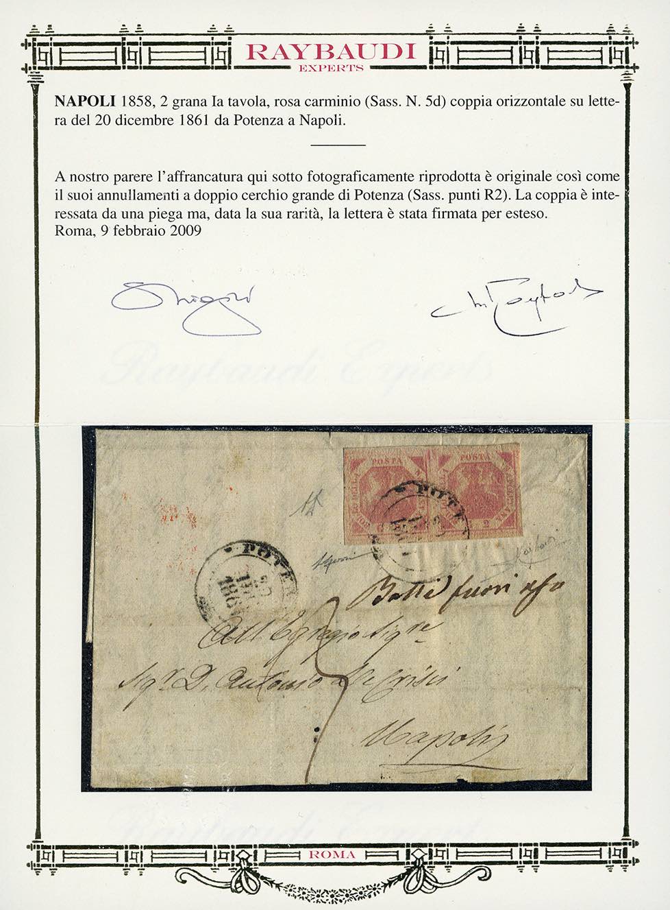 POTENZA, doppio cerchio grande punti R2 - 2 grana (5d), coppia, lieve piega orizzontale, su sovracoperta di lettera del 20/12/1861 a Napoli, manoscritto "bolli fuori uso" e tassa 3 grana. Insieme molto raro! A.Diena, Raybaudi, cert. Oro Raybaudi.