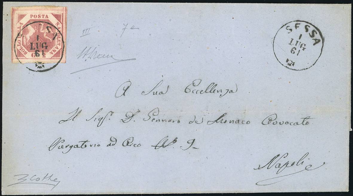 SESSA, cerchio piccolo ripetuto sulla soprascritta punti R2 - 2 grana (7e), perfetto, isolato su sovracoperta di lettera del 1/7/1861 per ... Read more