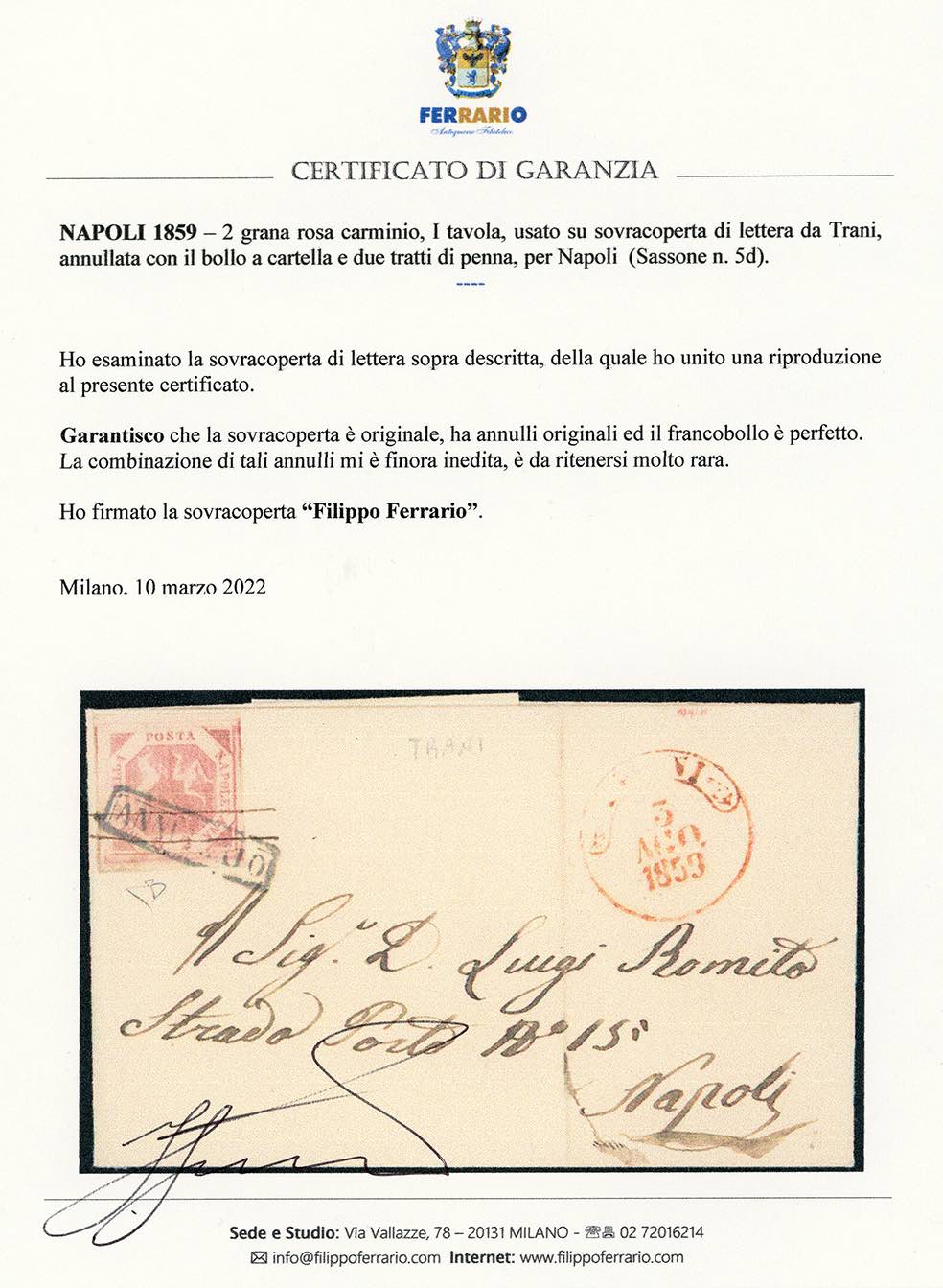 TRANI, penna annullato non catalogato - 2 grana (5d), perfetto, su sovracoperta di lettera del 3/8/1859 per Napoli. Nonostante non sia ancora stato catalogato, sono noti pochissimi casi di annullo a penna di Trani con due tratti paralleli. La combinazione con il bollo in cartella è inedita. Molto rara. E.Diena, cert. Ferrario.