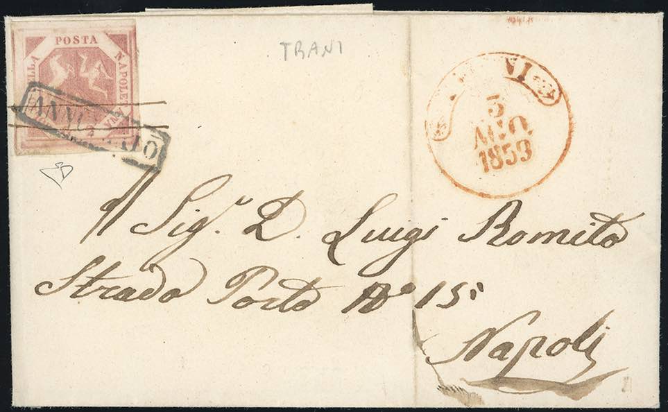 TRANI, penna annullato non catalogato - 2 grana (5d), perfetto, su sovracoperta di lettera del 3/8/1859 per Napoli. Nonostante non sia ... Read more