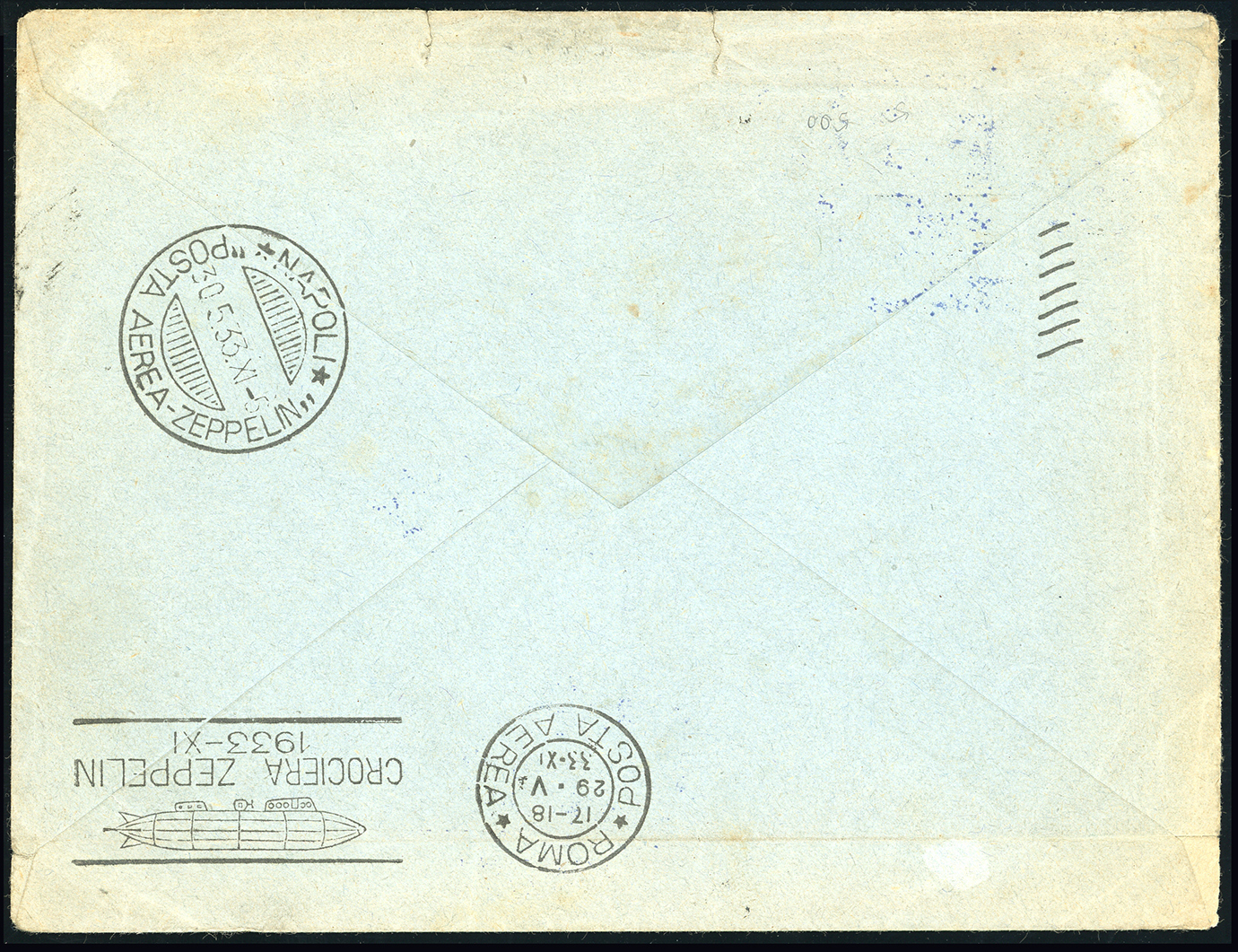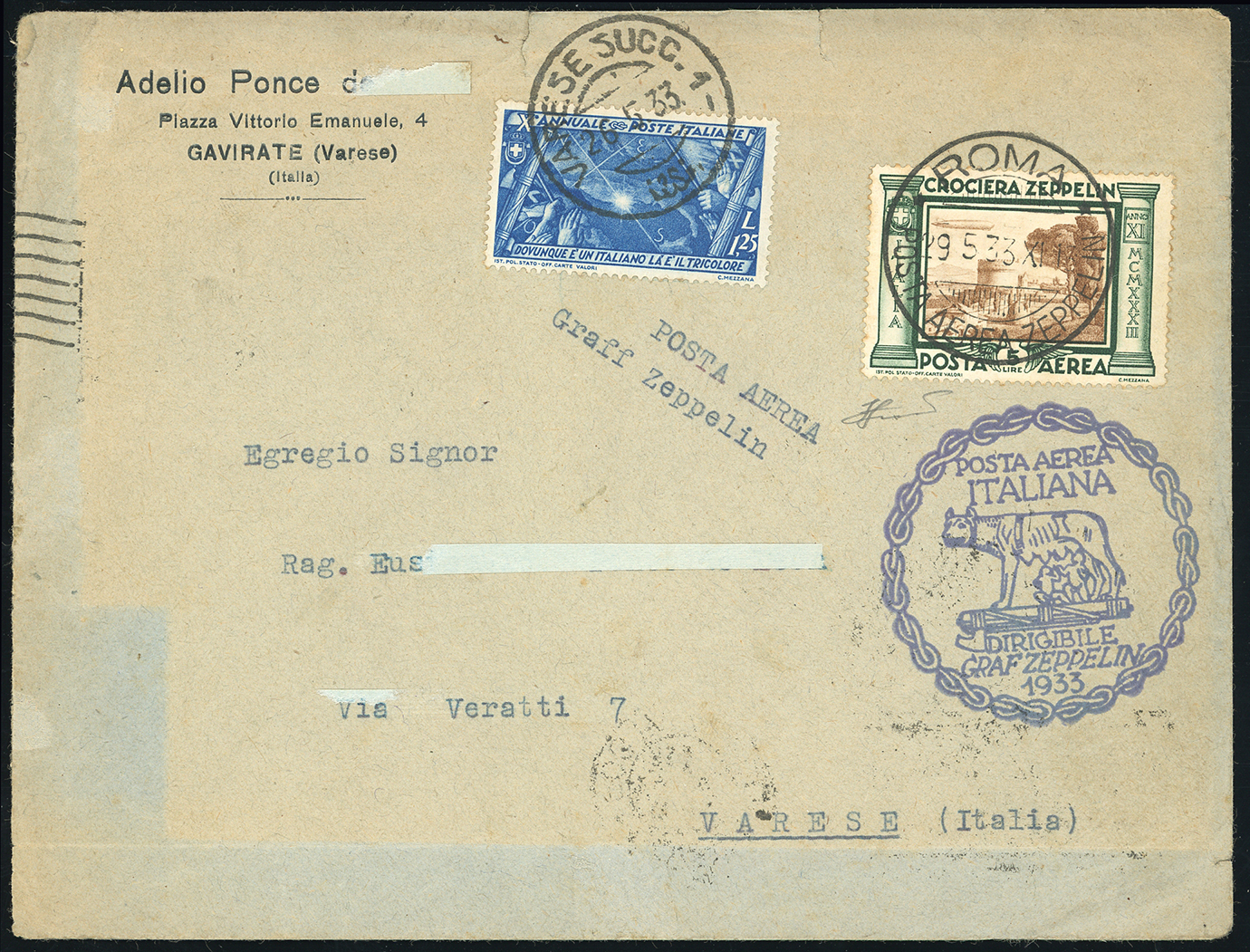 1933 - 5 lire Zeppelin, 1,25 lire Marcia su Roma (46,331), perfetti, su busta da Roma 29/5/1933 a Varese, bolli speciali del volo Zeppelin al recto e al verso. Ferrario.