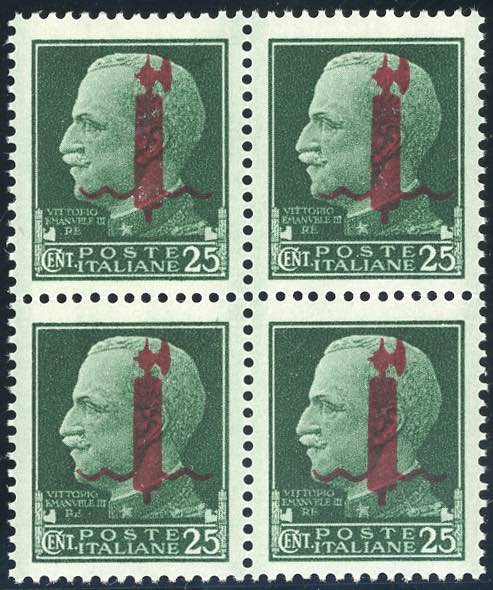 Lot 1395 - 1944 - 25 cent. soprastampato fascio in rosso (490), blocco ...