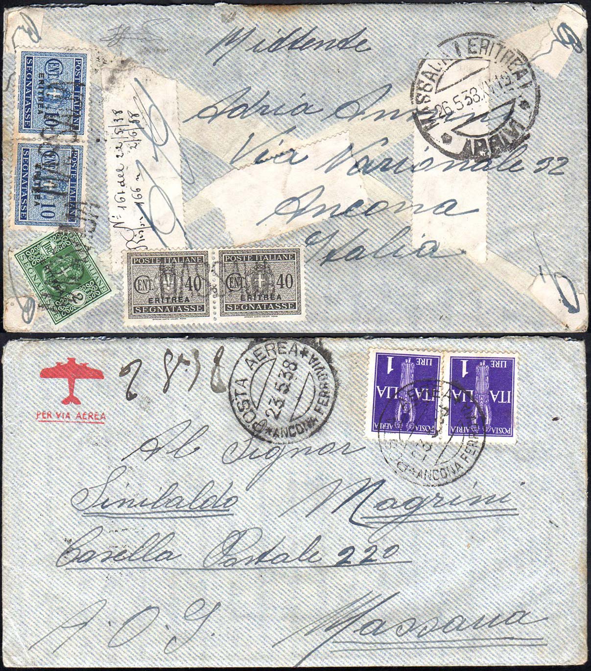 SEGNATASSE 1938 - 10 cent. azzurro, coppia, 40 cent. grigio, coppia, 2 lire verde (27,31,35), perfetti, al verso di busta da Ancona 23/5/1938 a Massaua, tassata per fermo posta. Eccezionale tassazione tricolore! Rarità. Ferrario.