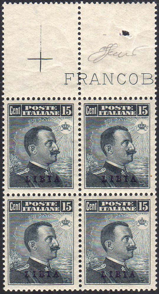 1912 - 15 cent. Michetti (5), blocco di quattro bordo di foglio e con ottima centratura, perfetto, gomma originale integra. Molto bello. ... Read more