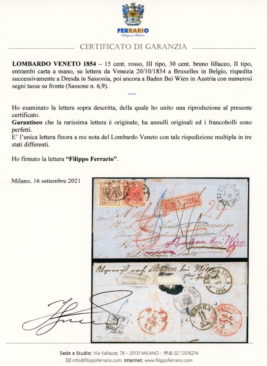 1854 - 15 cent. rosso, III tipo, 30 cent. bruno lillaceo, II tipo, entrambi carta a mano (6,9), perfetti, su lettera da Venezia 20/10/1854 a Bruxelles in Belgio, rispedita successivamente a Dresda, poi ancora a Baden Bei Wien, con numerosi segni di tassa sul fronte per i vari transiti. Eccezionale ed unico caso noto di rispedizione multipla in tre Stati differenti: Belgio, Sassonia ed Austria. Da esposizione! A.Diena, cert. Ferrario.