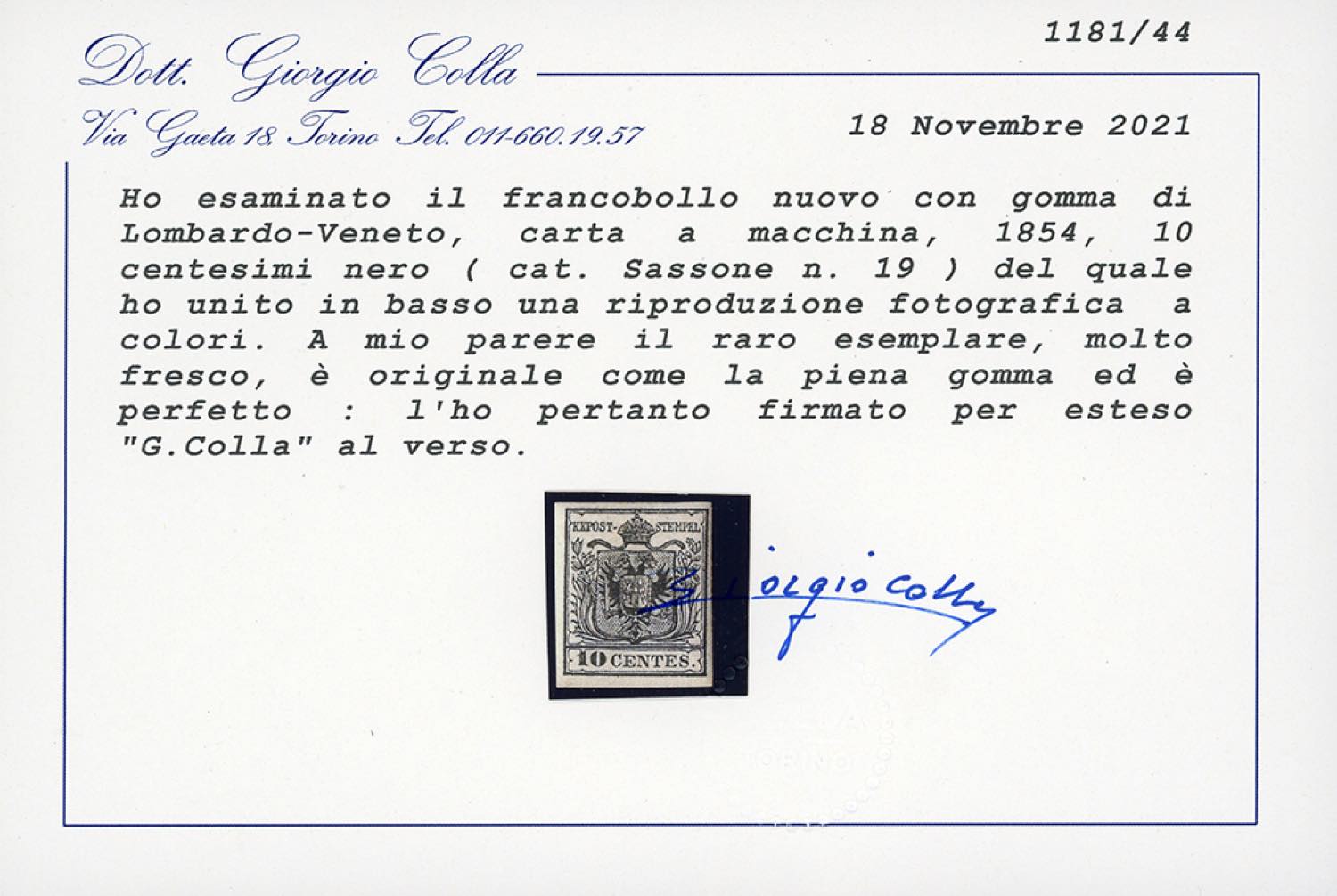 1857 - 10 cent. nero, carta a macchina (19), gomma originale, perfetto. Bello e raro! Sorani, cert. Colla.