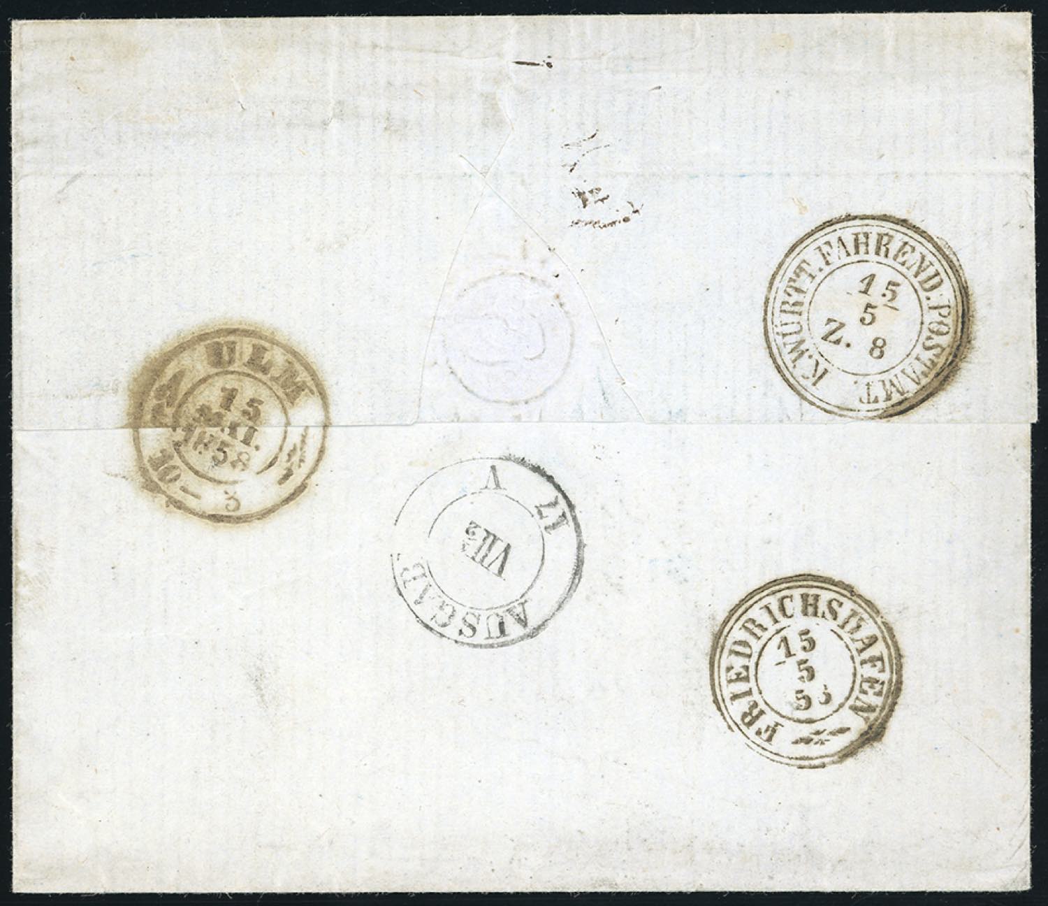 1858- 15 cent. rosso vermiglio, III tipo, carta a macchina (20), striscia orizzontale di tre, perfetta, su sovracoperta di lettera da Lecco 12/5/1858 a Lipsia, numerosi segni di tassa sul fronte, anche cassati. Insieme estremamente raro, di splendida qualità. Chiavarello. Ex coll. Imperato.