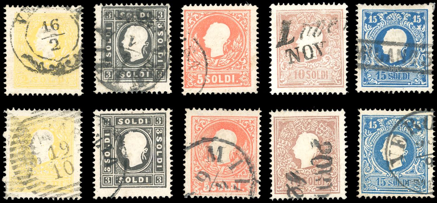 1858/59 - Seconda emissione, serie completa del I e del II tipo (23/27,28/32), usati, perfetti.
