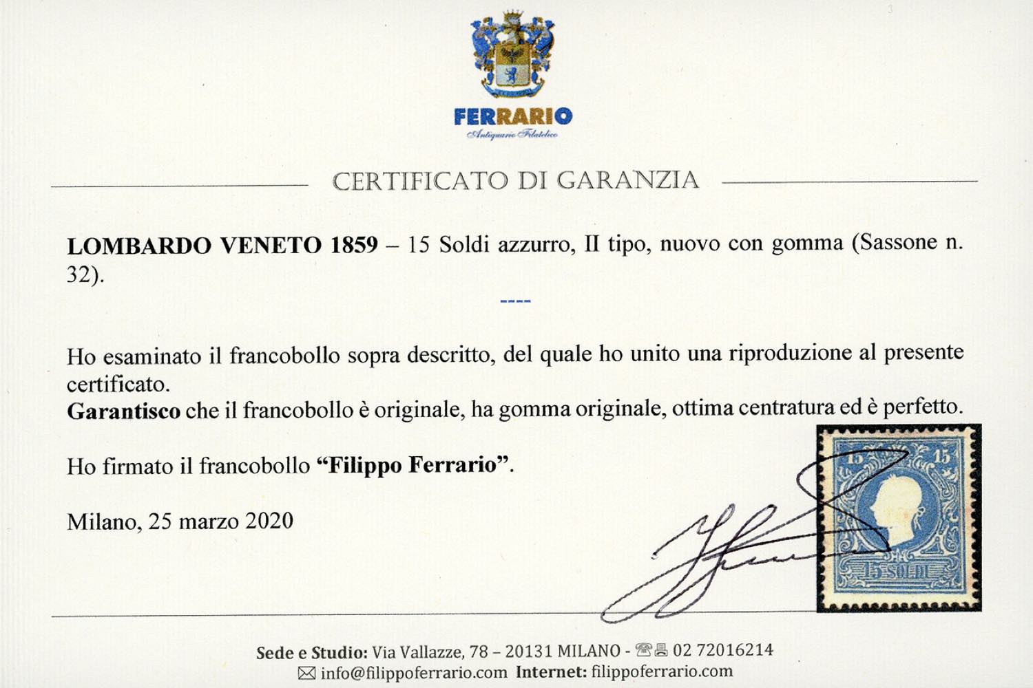1859 - 15 soldi azzurro, II tipo (32), gomma originale, perfetto e di ottima centratura. Bello e raro. A.Diena, cert. Ferrario.