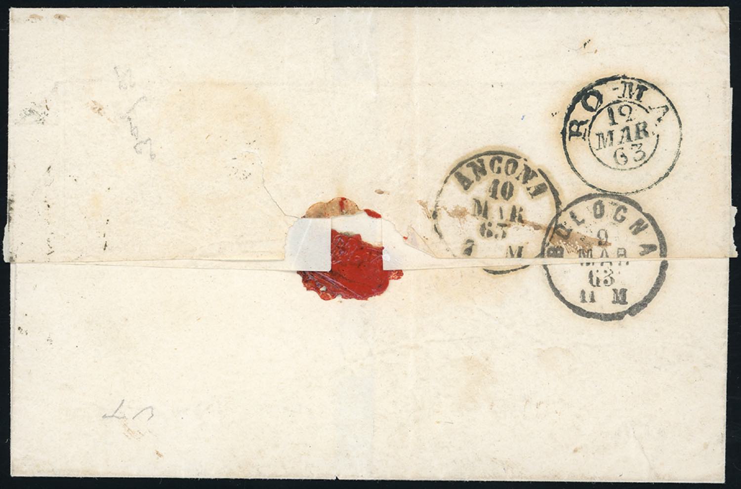 1863 - 3 soldi verde giallo e 10 soldi bruno mattone (34,35), perfetti, su fresca sovracoperta di lettera da Venezia 8/3/1863 a Roma, indirizzata ad un ecclesiastico, con la rara tariffa da 13 soldi non menzionata dai cataloghi. Insieme del tutto raro. Cert. G.Colla.