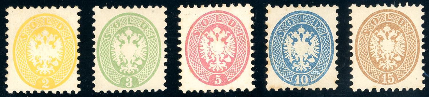 1864/65 - Quinta emissione, dent. 9 1/2, serie completa (41/45), gomma originale, perfetti, lievi ossidazioni sul 10 soldi. Alti valori ... Read more