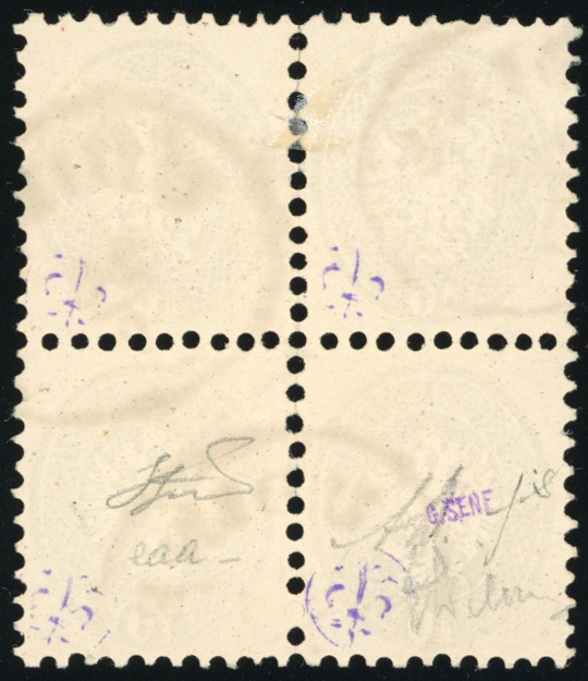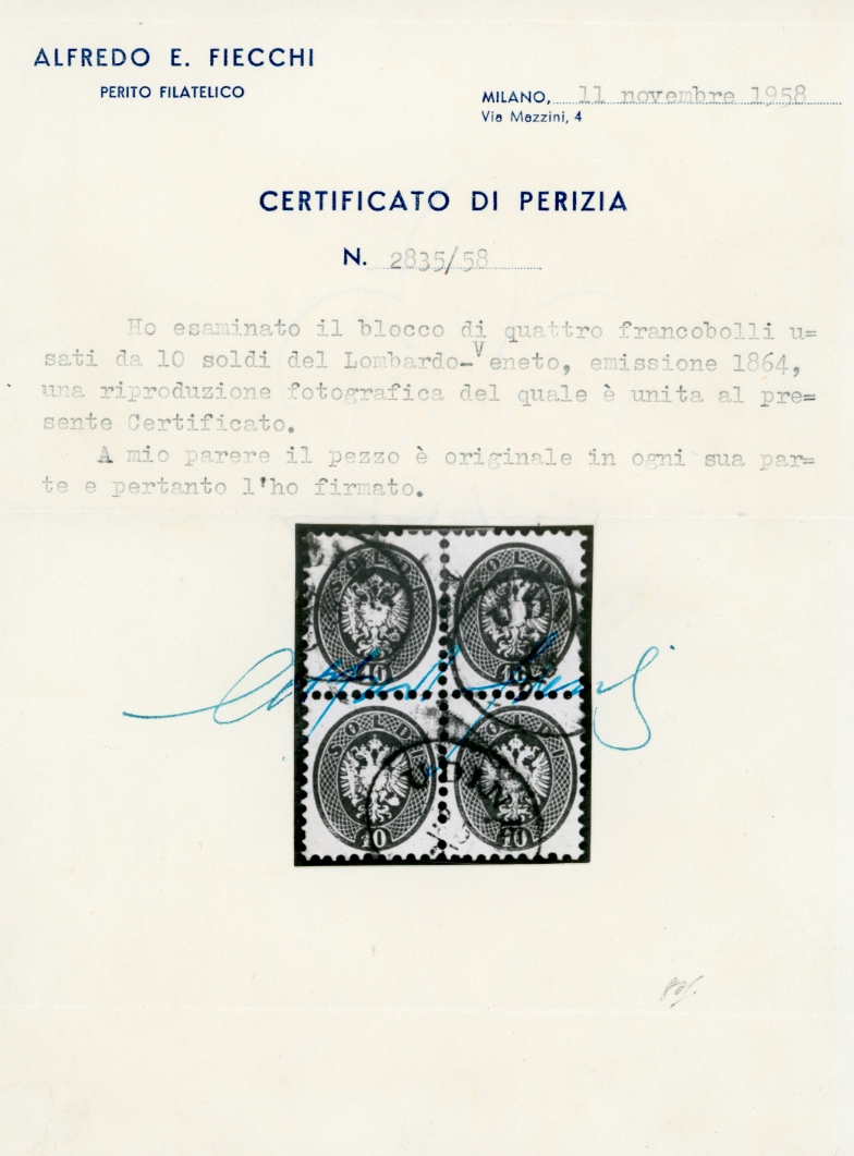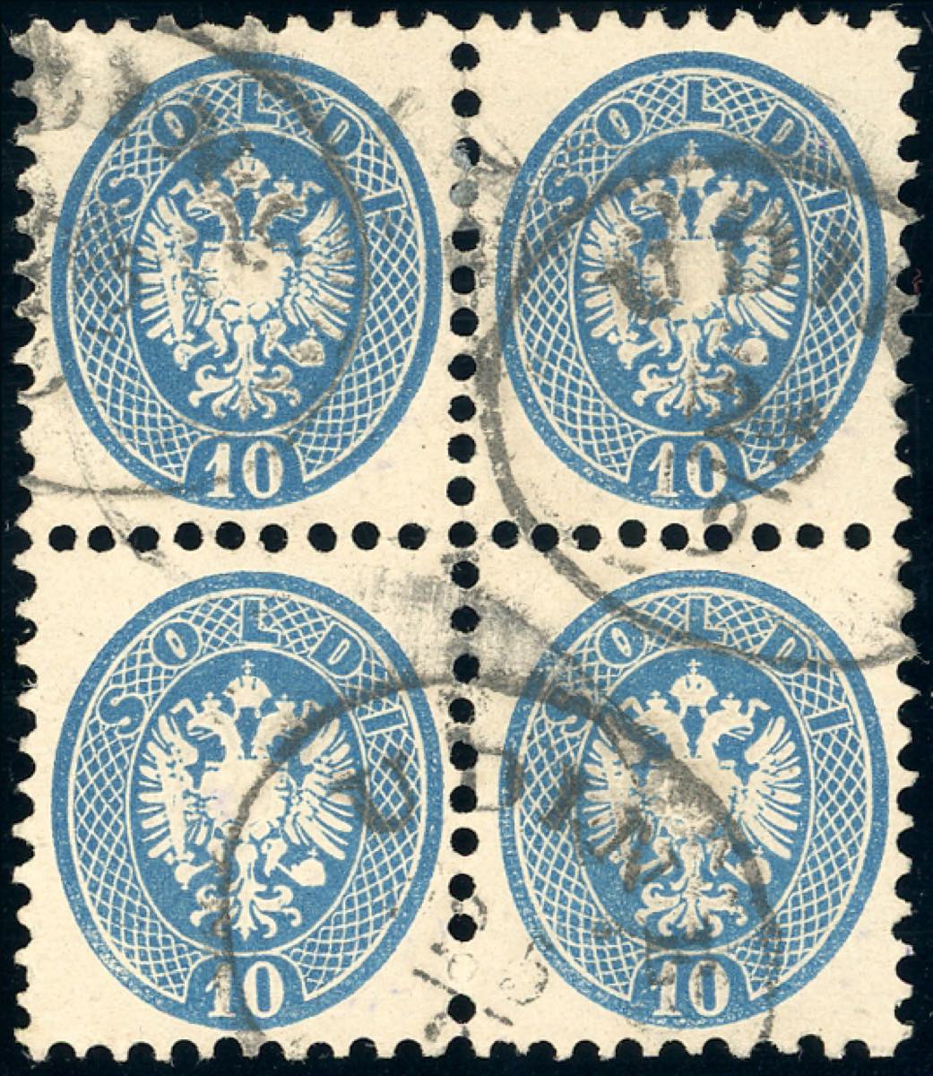 1864 - 10 soldi azzurro, dent. 9 1/2 (44), blocco di quattro usato ad Udine, perfetto. Molto bello! Ferrario, cert. Fiecchi.