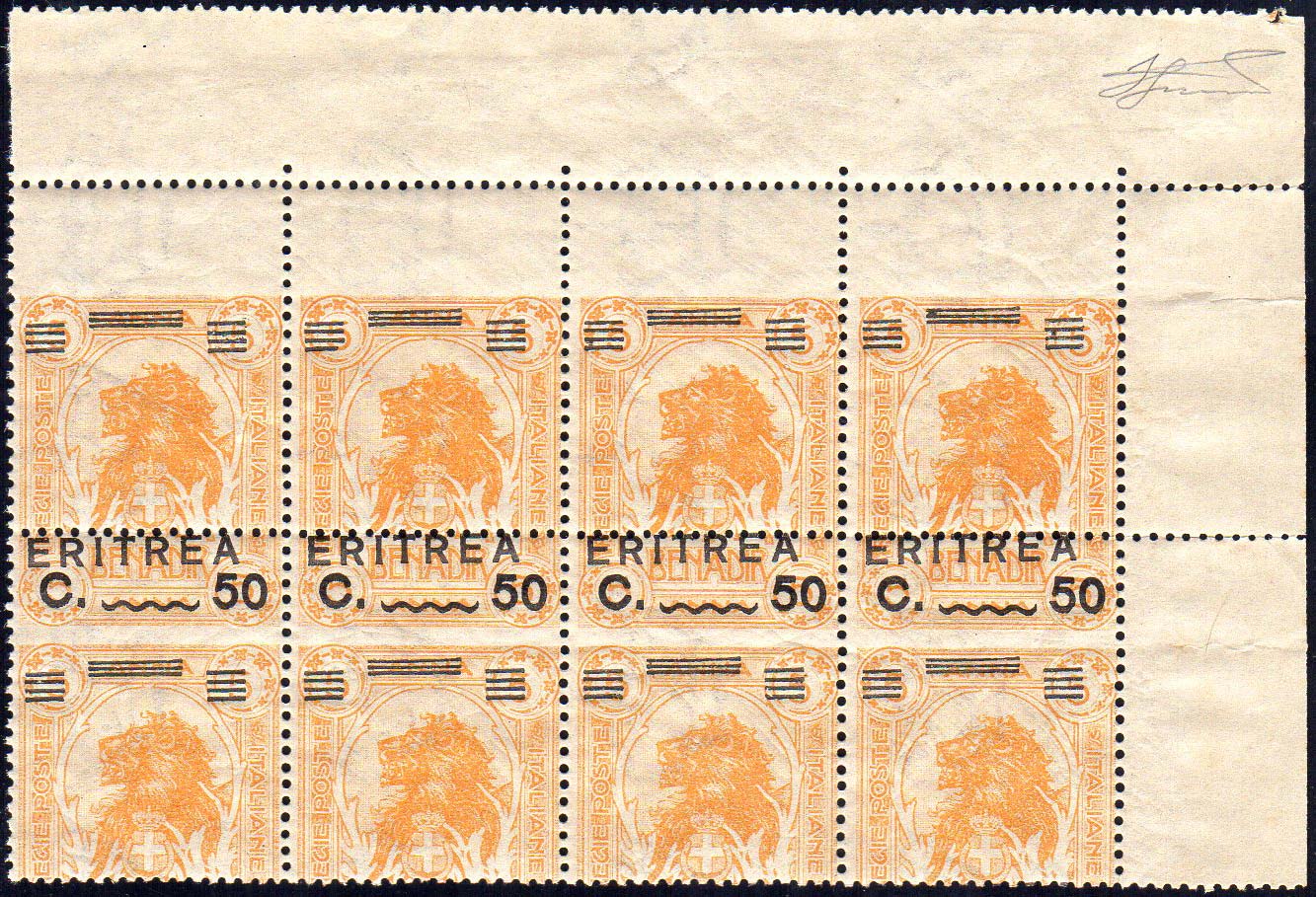 1922 - 50 c. su 5 a. giallo Leoni, blocco di otto dentellatura orizzontale fortemente spostata, angolo di foglio, con 4 esemplari superiori ... Read more