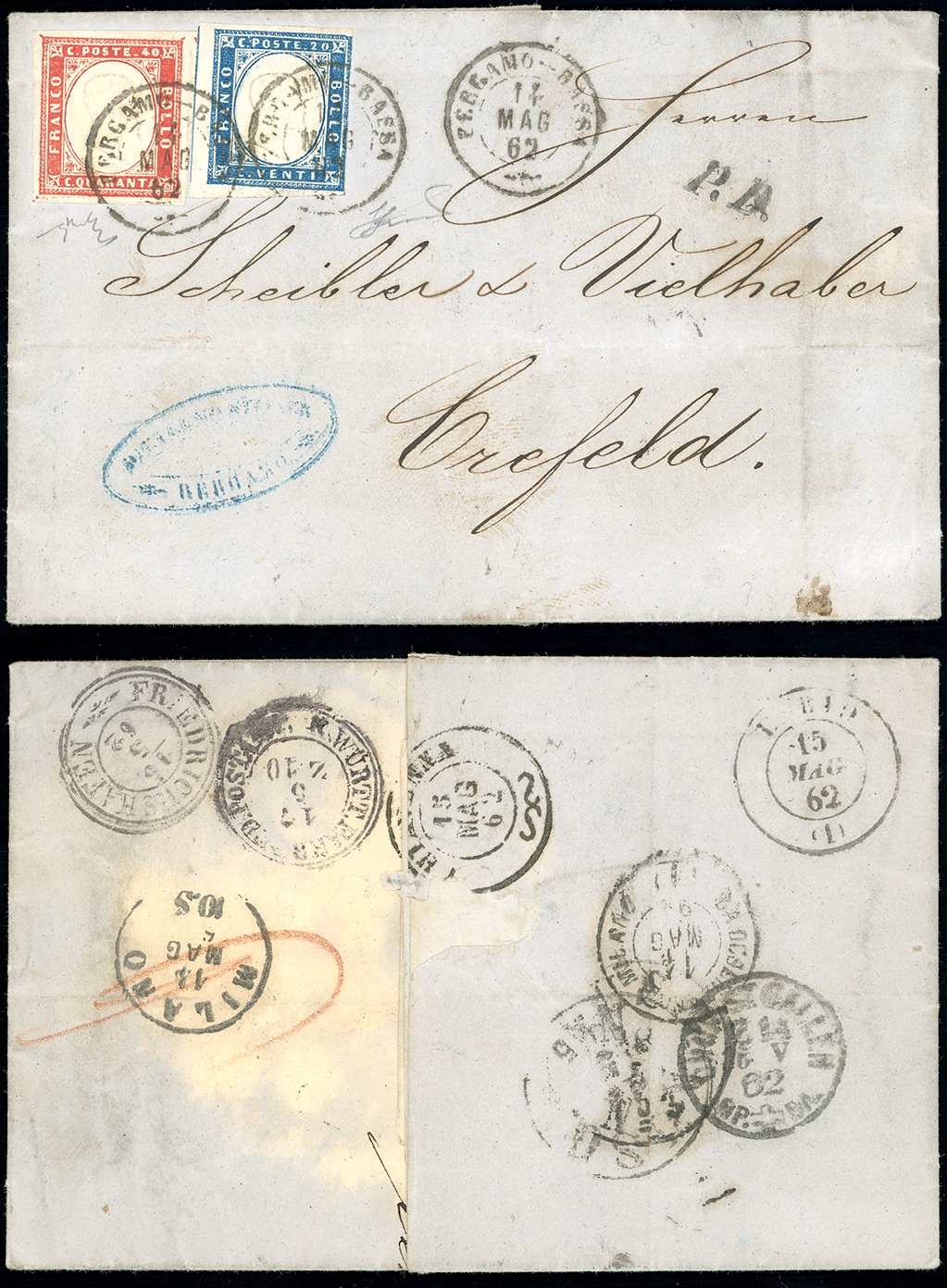 1862 - 40 cent., perfetto, 20 cent., sfiorato a destra (16Da,15Da), su fresca lettera da Bergamo Bassa 14/5/1862 a Crefeld, in Germania, viaggiata per la "VIA DI SVIZZERA", bolli di transito e arrivo al verso, tra cui il lacuale "Lario (1)". Bella e non comune. Ferrario, Chiavarello.