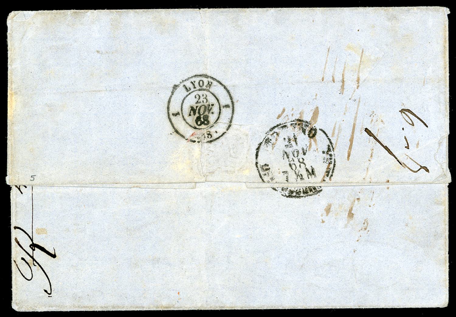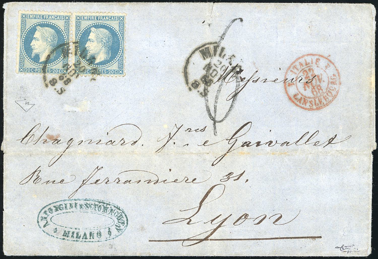 1868 - 20 cent. Napoleone III laureato, II tipo (Francia 29A), due esemplari, perfetti, su sovracoperta di lettera da Milano 20/11/1868 a Lione. Malgrado l'affrancatura sia stata annullata in partenza, la lettera venne tassata in arrivo 60 cent. Di grande interesse e rarità. Cert. E.Diena.