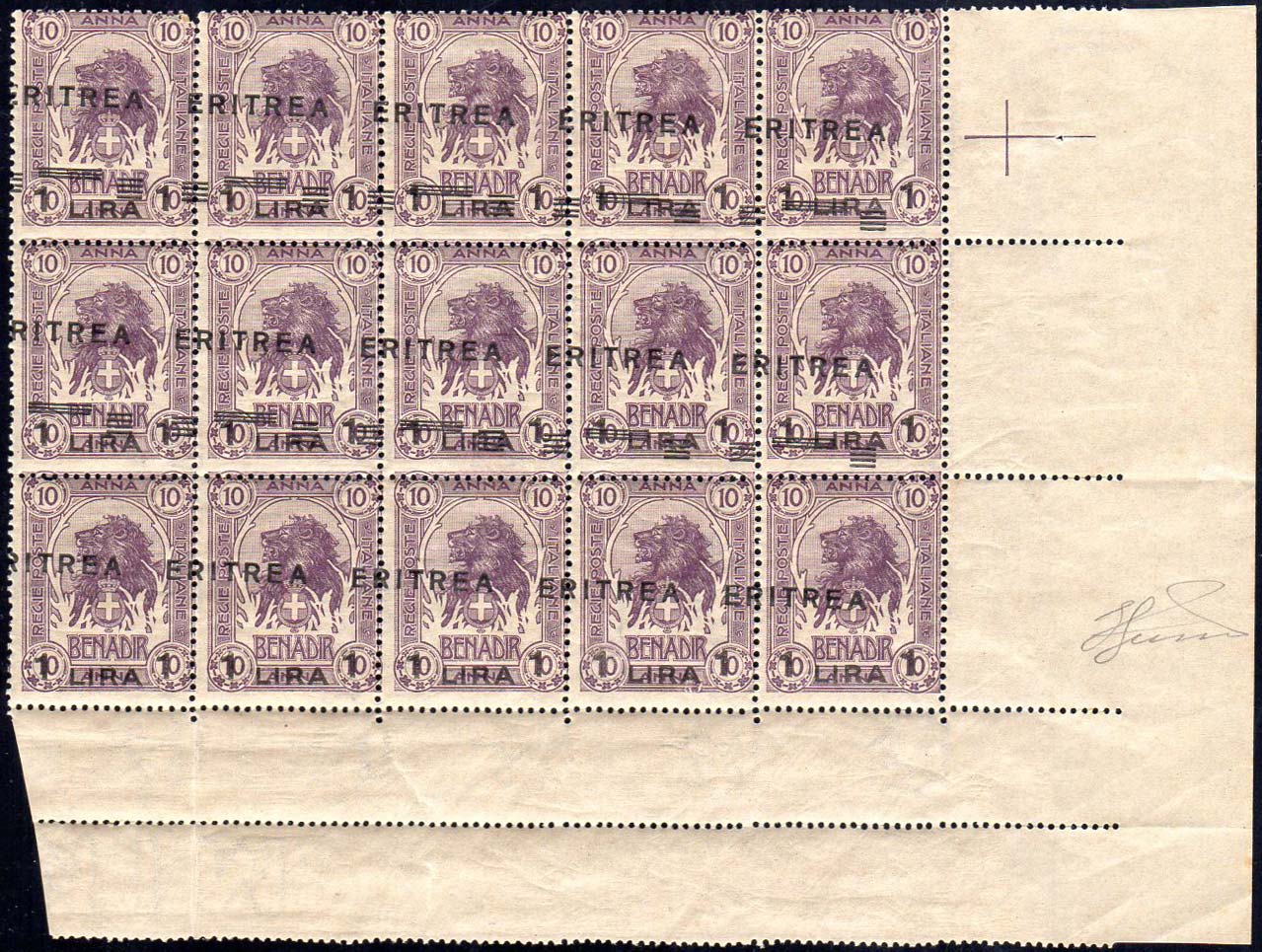 1922 - 1 l. su 10 a. Leoni (60), blocco di 15 esemplari angolo di foglio, dicitura ERITREA e sbarrette fortemente spostate in alto ed oblique, i 5 esemplari inferiori senza sbarrette e dicitura a cavallo, l'ultimo con sola dicitura parziale ITREA, gomma originale integra, perfetto. Insieme unico e non catalogato! Ferrario.