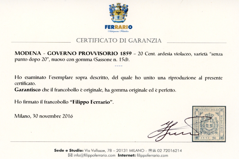 1859 - 20 cent. ardesia violaceo, varietà "senza punto dopo 20" (15d), perfetto, nuovo, gomma originale. Bello e raro! Enzo Diena, Vaccari. Cert. Ferrario.