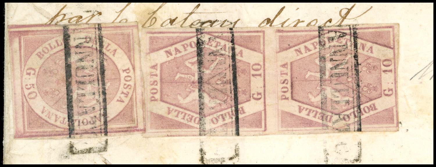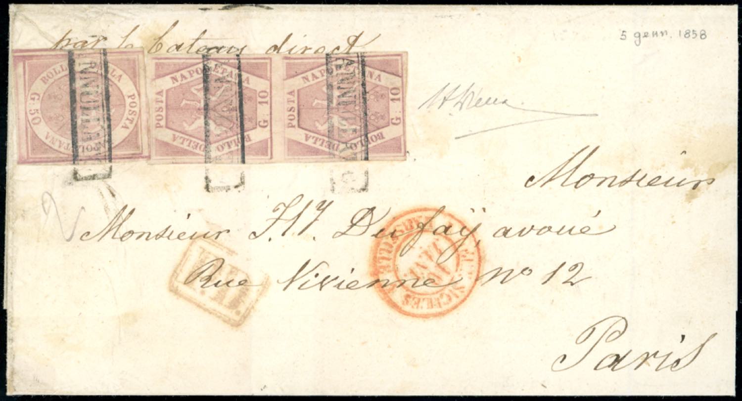 1858 - 50 grana rosa brunastro, perfetto e con grandi margini, 10 grana rosa brunastro, I tavola, coppia verticale, perfetta (14,10), su sovracoperta di lettera di due porti da Napoli 5/1/1858 a Parigi. Splendida lettera risalente ai primissimi giorni d'uso dei francobolli di Napoli. Cert. A.Diena.