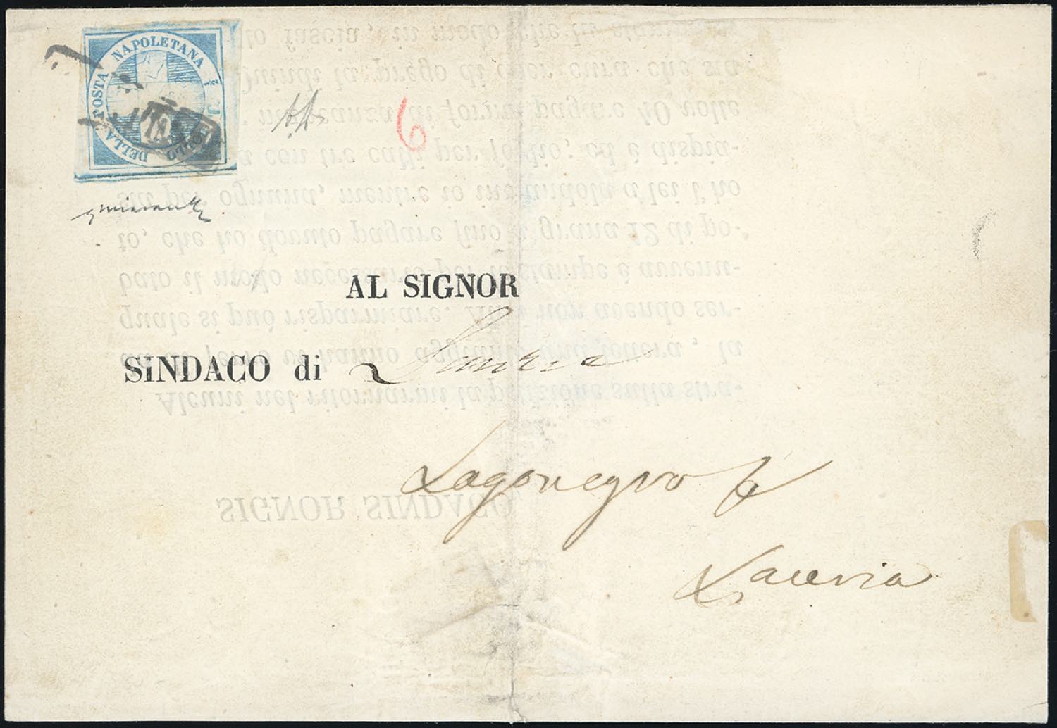 1860 - 1/2 tornese azzurro chiaro Crocetta (16a), perfetto, su circolare da Napoli 15/12/1860 a Lauria. Molto rara e bella! Chiavarello, cert. A.Diena.